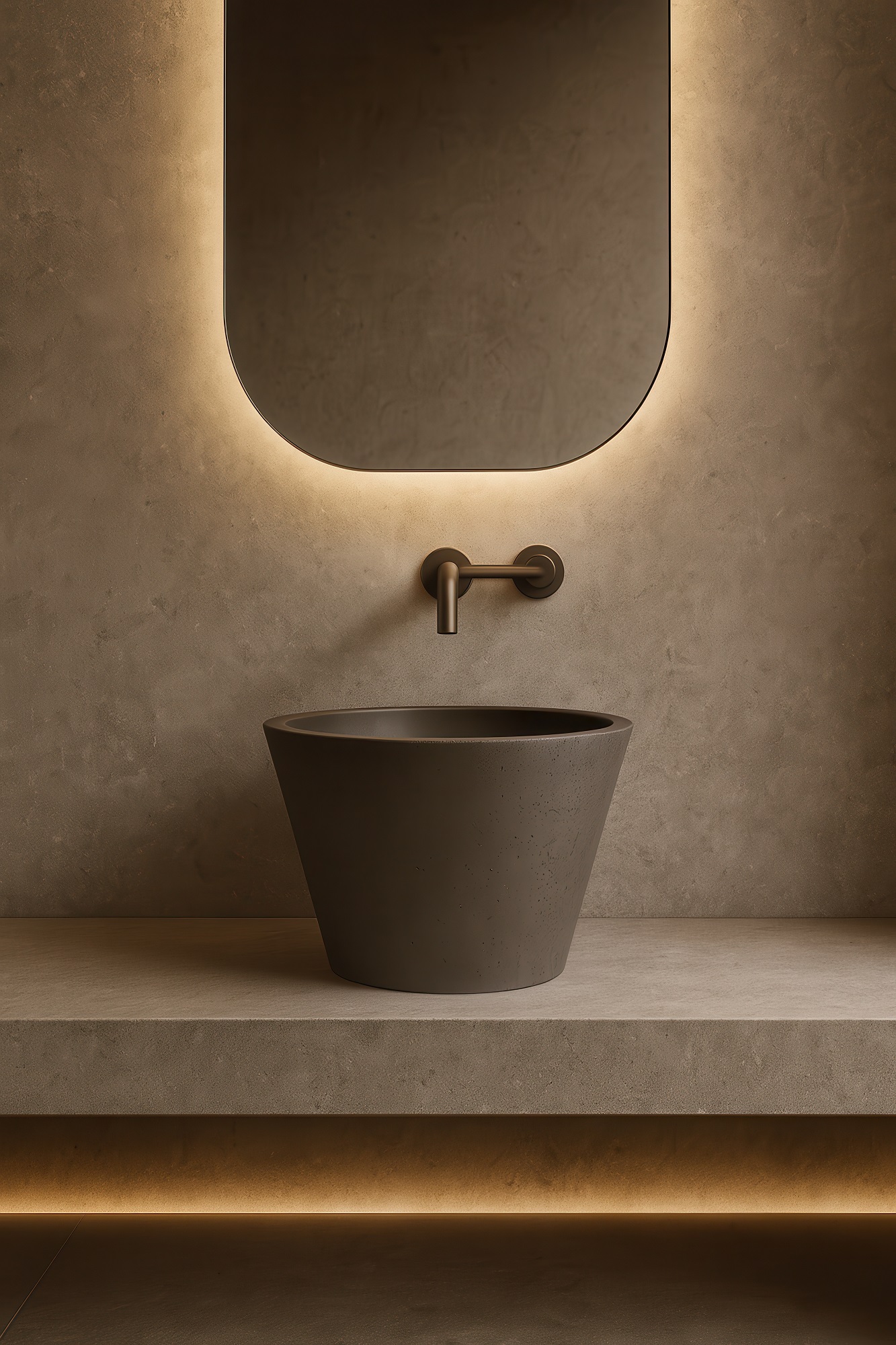 Circum 3826 basin comes in a unique conical shape. The properties of concrete as a base material enhance the minimalist design of Circum countertop washbasins. The small air holes and the subtle color variations are the small details that shape its character. Ideal for both residential and commercial spaces, it elevates the space in its own unique way.