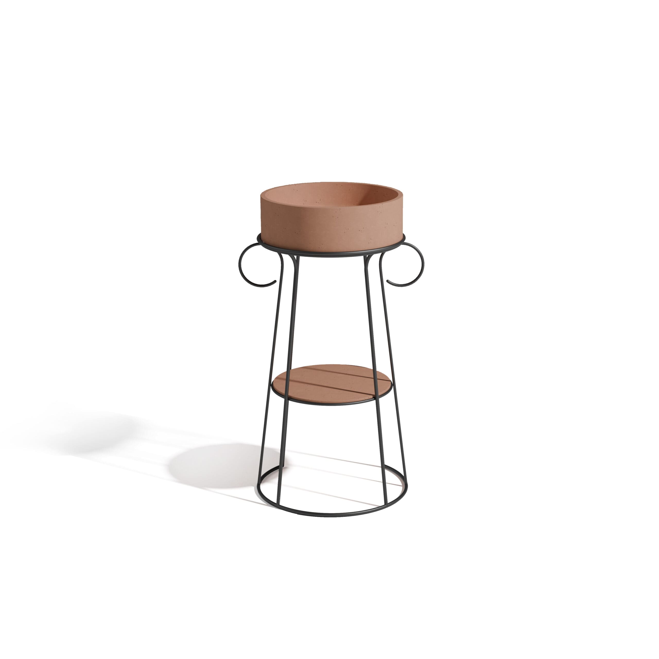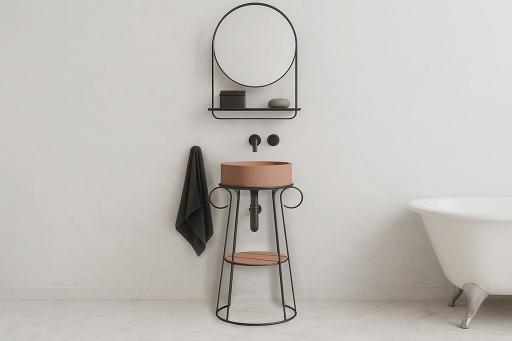 Relia 39 washbasin designed by CTRLZAK design studio, reference classic product created by Urbi et Orbi, translating the elegance and contemporary language in space, showcasing the best features of concrete: from durability to its polyvalent simplicity. The metal structure with the incorporated shelf not only o ers support but also various possibilities of use, from towel support to the hanging of diverse accessories.